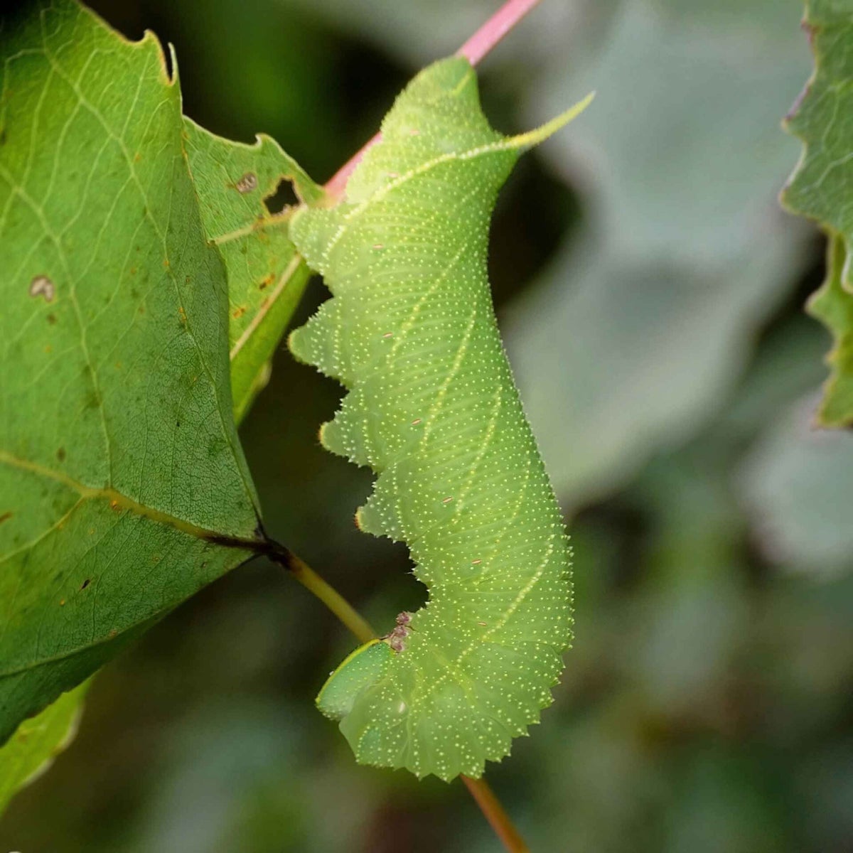 Zur Eiablage werden von den Weibchen Pappelschößlinge besonders bevorzugt. Die frisch geschlüpfte 5 mm lange Larve, die ihre Eierschale teilweise auffrisst, ist blassgrün, sehr rau, mit kleinen, gelben Warzen und hat einen runden Kopf und ein cremefarbenes Horn. Nach der ersten Häutung erscheinen bereits gelbe Seitenstreifen. Die Jungraupen halten sich noch vorwiegend an der Mittelrippe der Blattunterseite auf. Bereits nach der zweiten Häutung nehmen sie ihre charakteristischere sphinxähnliche Haltung ein und hängen mit ihren letzten beiden Beinpaaren unter einem Blatt oder einem Stängel. Zeit ihres Raupenlebens sind sie nicht sehr aktiv und neigen dazu, im selben Nahrungsbereich zu bleiben, wobei sie viele Triebe abwandern. Die erwachsene Raupe fällt durch ihre körnige Haut auf und kann als auffälliges Zeichnungsmuster eine Doppelreihe rostroter Flecken tragen. Es kommen allerdings auch Formen ohne diese Flecken vor, die hin und wieder mit Raupen des Abendpfauenauges verwechselt werden. Die Verpuppung erfolgt am Fuße der Nahrungspflanze 2-3 cm unter der Erde oder Laub.